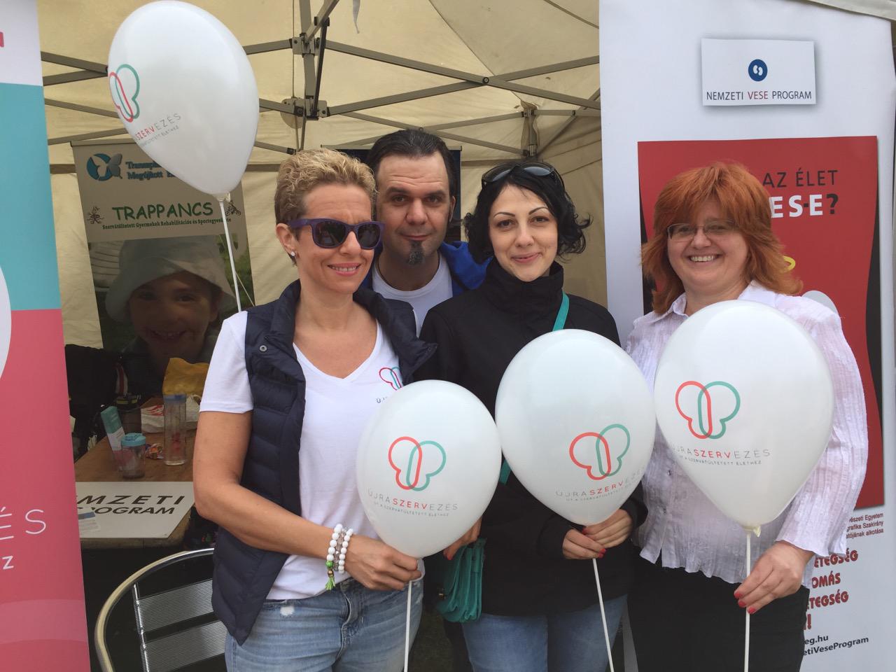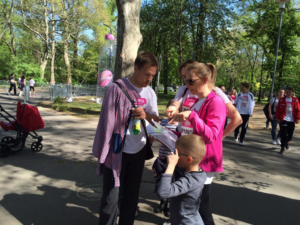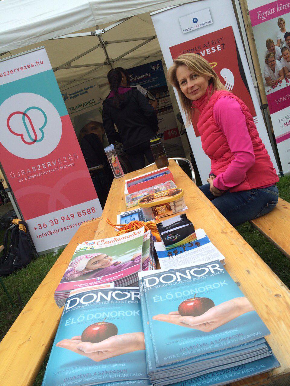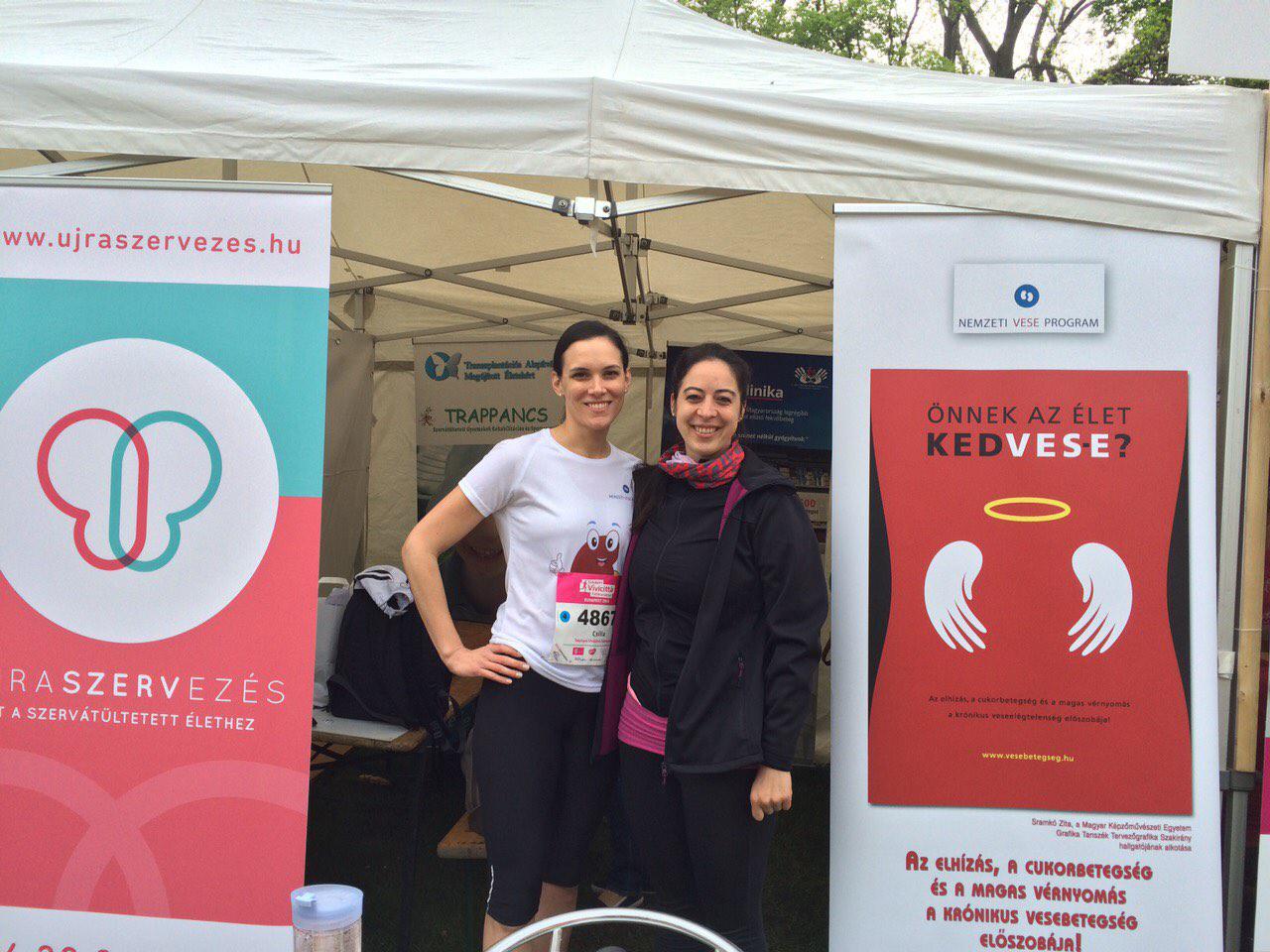 Szombaton „csak” futottunk, vasárnap viszont reggel 9-től du. 4-ig teljes létszámban kint voltunk a Nemzeti Vese Program 35-ös számú sátrában a Nagyréten! Tájékoztattunk, beszélgettünk a vesetraszplantációról, koleszterin-, és vércukor-szintet mértünk a felnőtteknek, miközben a kicsik rajzolhattak, színezhettek. Örültünk Reusz professzor úrnak és Rokszin doktornak, spontán megbeszélést tartottunk Maléth Anikó transzplanrációs koordinátorral. Nem utolsósorban persze nagyon drukkoltunk a Nemzeti Vese Program futónagyköveteinek!