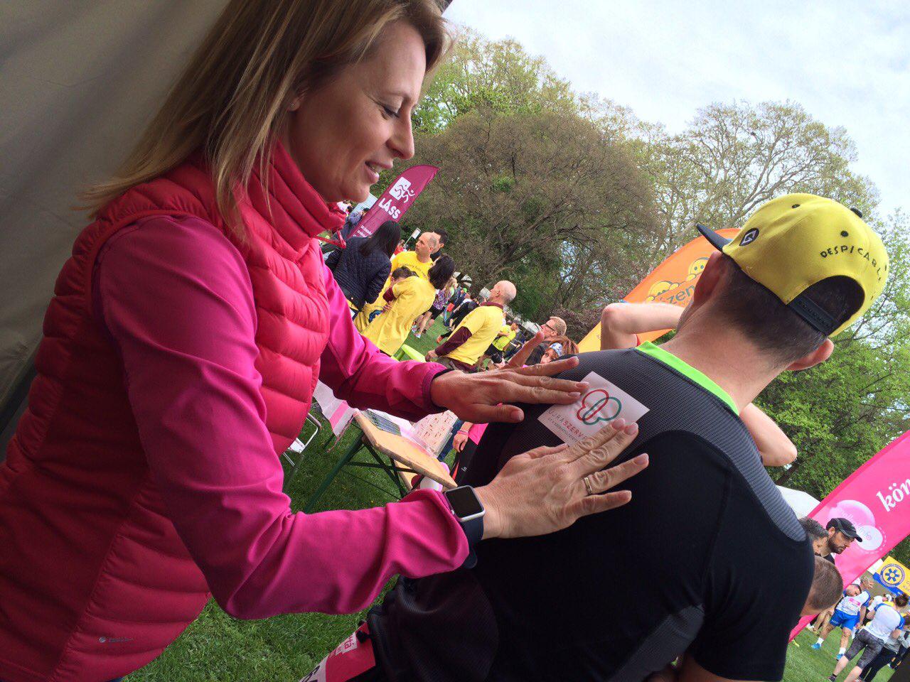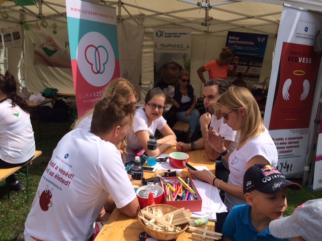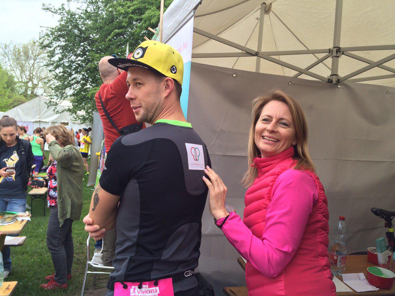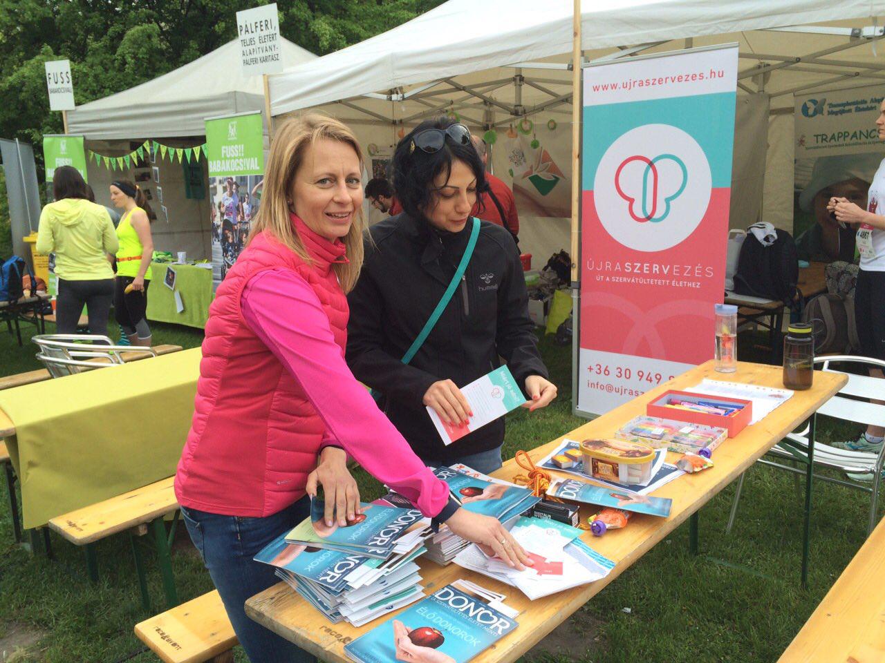 Szombaton „csak” futottunk, vasárnap viszont reggel 9-től du. 4-ig teljes létszámban kint voltunk a Nemzeti Vese Program 35-ös számú sátrában a Nagyréten! Tájékoztattunk, beszélgettünk a vesetraszplantációról, koleszterin-, és vércukor-szintet mértünk a felnőtteknek, miközben a kicsik rajzolhattak, színezhettek. Örültünk Reusz professzor úrnak és Rokszin doktornak, spontán megbeszélést tartottunk Maléth Anikó transzplanrációs koordinátorral. Nem utolsósorban persze nagyon drukkoltunk a Nemzeti Vese Program futónagyköveteinek!